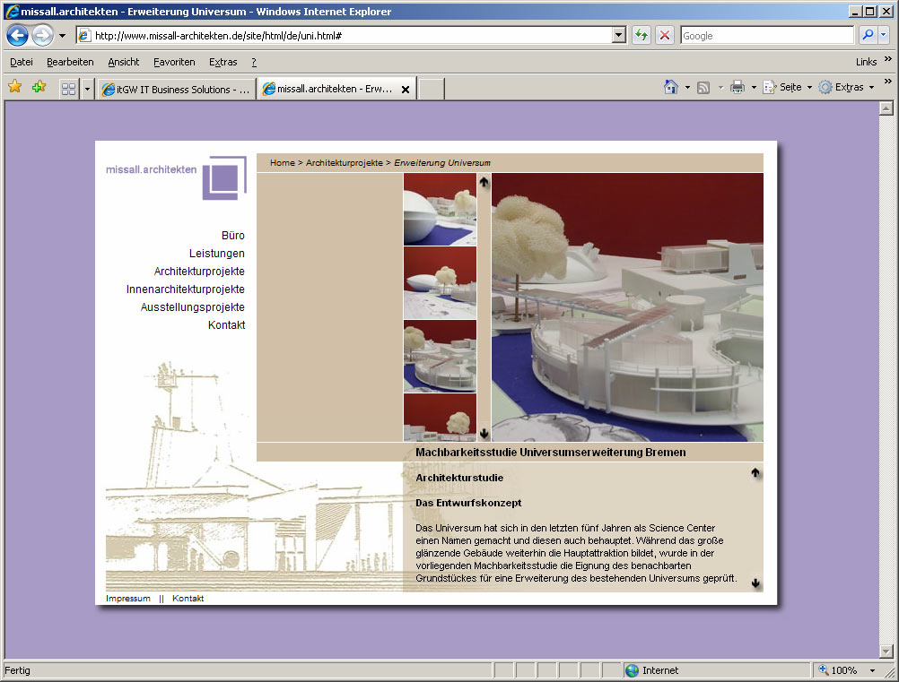 „Als Architekten haben wir es abgelehnt HTML zu lernen, daher haben wir im ersten Schritt eine „Visitenkarte” unseres Büros ins Netz stellen lassen, da hier keine Pflege der Webseite nötig war. Mit dem Designer Marcus Neuhardt haben wir dann im Frühjahr 2006 erste Gespräche über einen neuen Webauftritt in Verbindung mit einem CMS-System geführt. Im August des Jahres haben wir Herrn Neuhardt beauftragt, und ihm in der Gestaltung völlig freie Hand gelassen.
